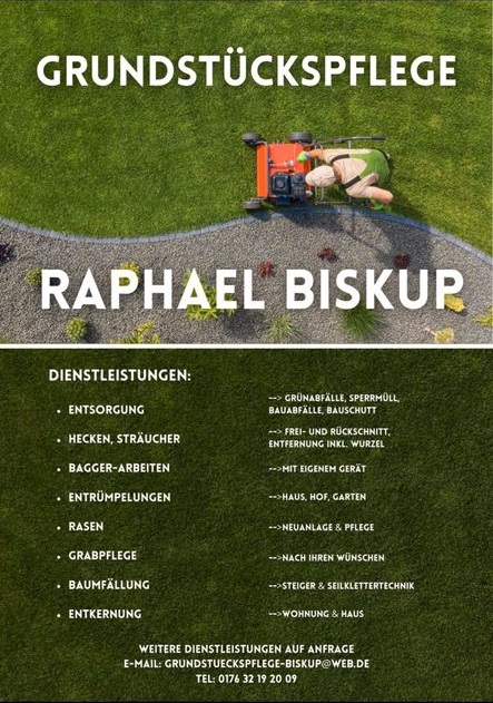 Wir sind Ihr Spezialist aus Hambergen im Bereich Garten- und Landschaftsbau, Gartenbau, Gartenpflege oder Galabau. Mit kreativer Ader gestalten wir Ihren persönlichen Wunschgarten. Rufen Sie uns einfach über die Nummer 0176/32192009 an und lassen Sie uns in einem persönlichen Beratungsgespräch herausfinden, welche Art von Gartengestaltung für Sie das Richtige ist! Unsere Leistungen: Unser Arbeitsfeld erstreckt sich von der Beratung, Planung und Ausführung bis hin zur Betreuung und Pflege von Außenanlagen jeglicher Art. Mit wem haben Sie es zu tun? Mein Name ist Raphael Biskup ich bin 24 Jahre alt und wohne in Hambergen. Ich arbeite hauptberuflich bei der Bundeswehr und werde mich nach meiner abgeleisteten Dienstzeit in die komplette Selbstständigkeit absetzen. Ich bin zweifacher Familienvater von einem Sohn und einer Tochter. Meine Hobbys waren schon immer die Gartenarbeit, also warum nicht gleich das Hobby zum Beruf machen? Ebenfalls bin ich ausgebildeter Baumkletterer, und werde mich immer weiterbilden, um Ihnen den bestmöglichen Service zu bieten.Dienstleistungen und Preisliste